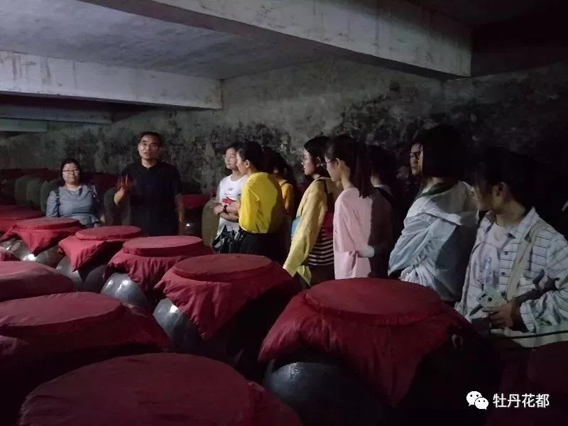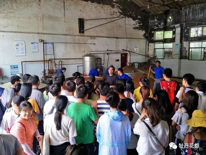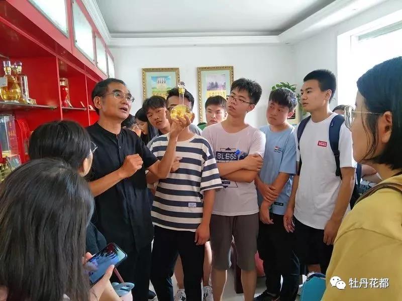 最后一站,酒品形象展示店,陈列着能满足低、中、高端不同层次消费者需求的酒品,大家对独具特色的牡丹花酒特感兴趣,“花是怎么放进去的?牡丹花的元素是怎么酿出来的?”不时有同学发问请教。